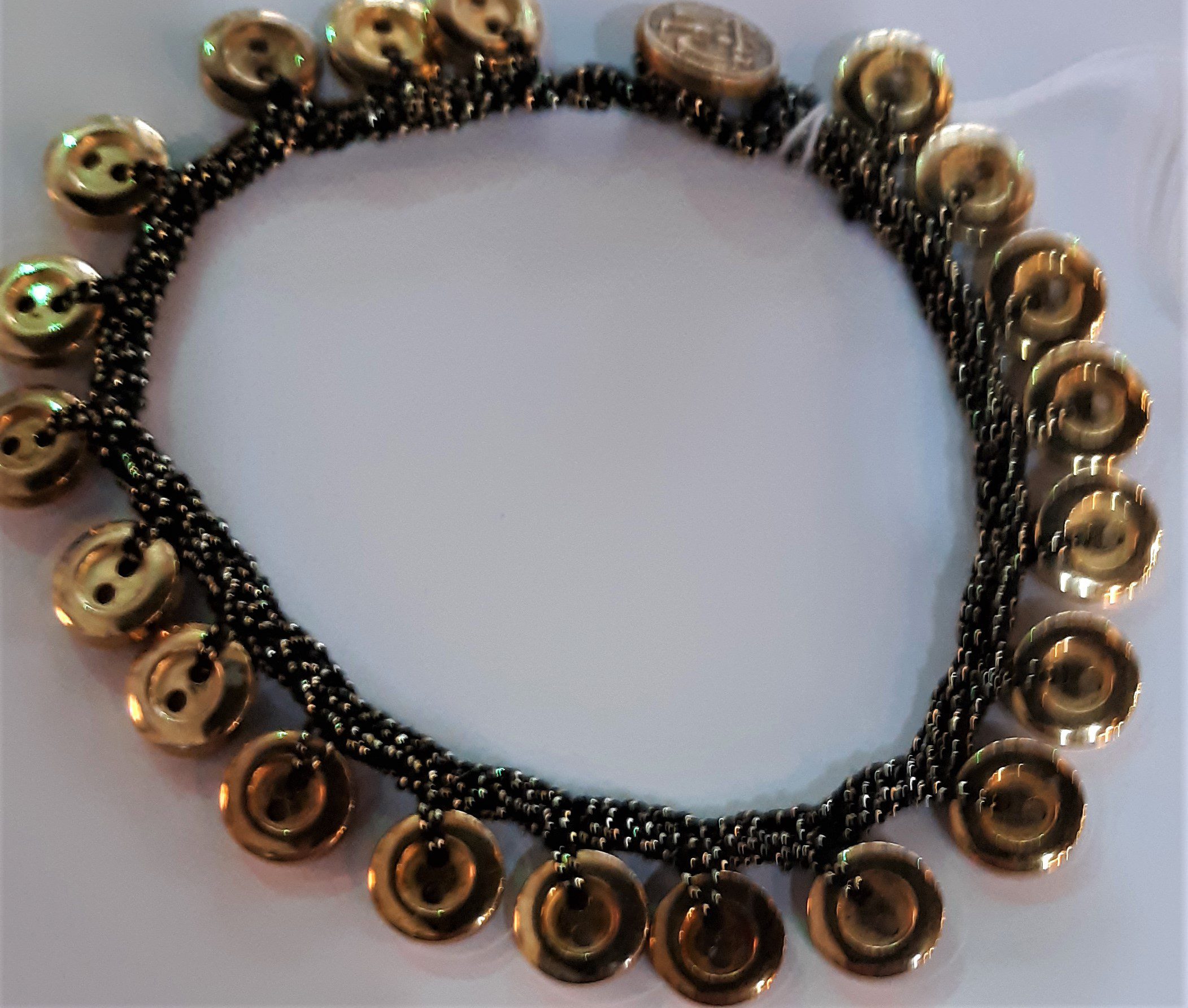 Gold vintage buttons dangle from black & gold crochet chain. Anklet.