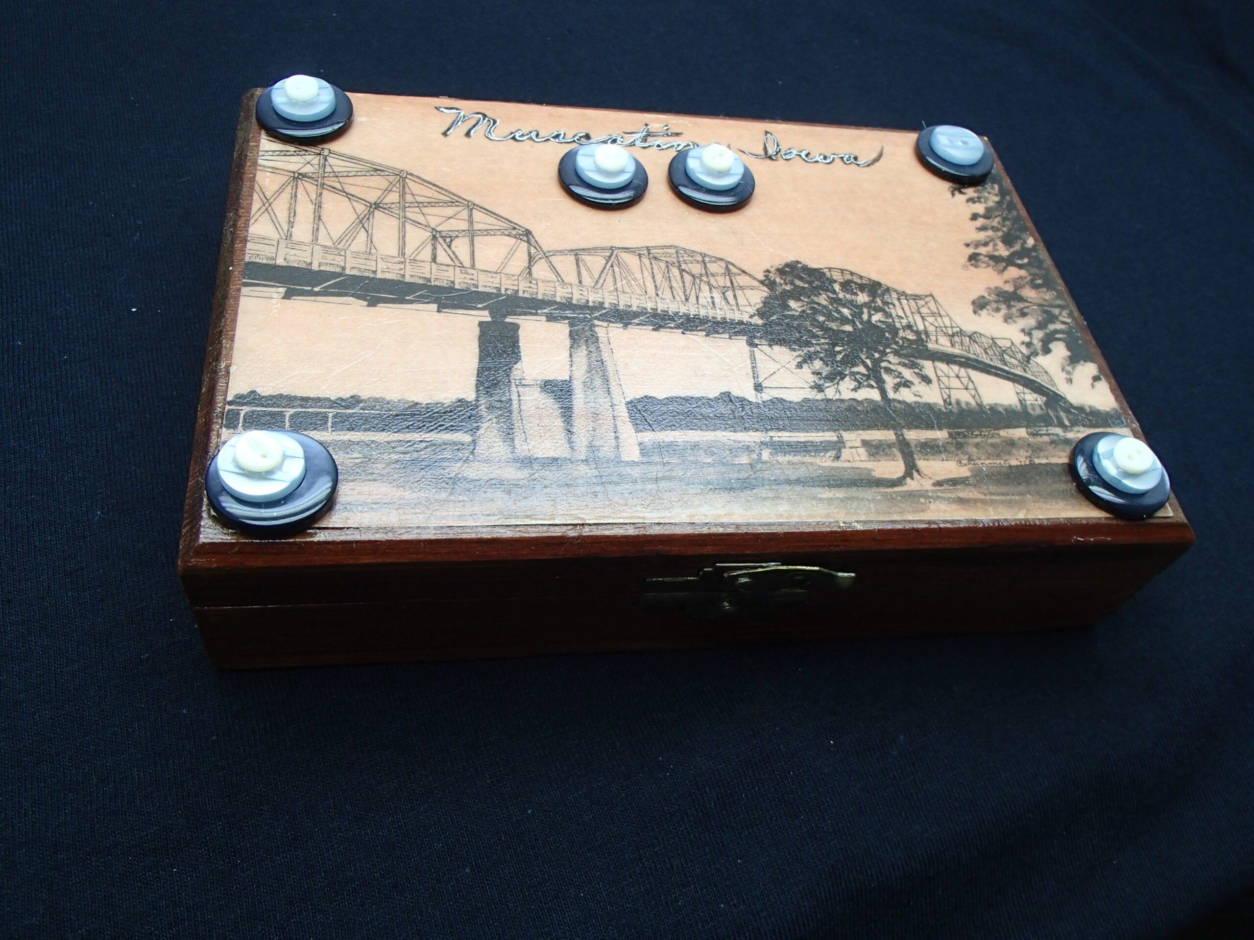 wooden box with print of Muscatine old high bridge by Carol Steinmetz. Adorned with pearl and vintage buttons. 6.25x 4:25x1.25”