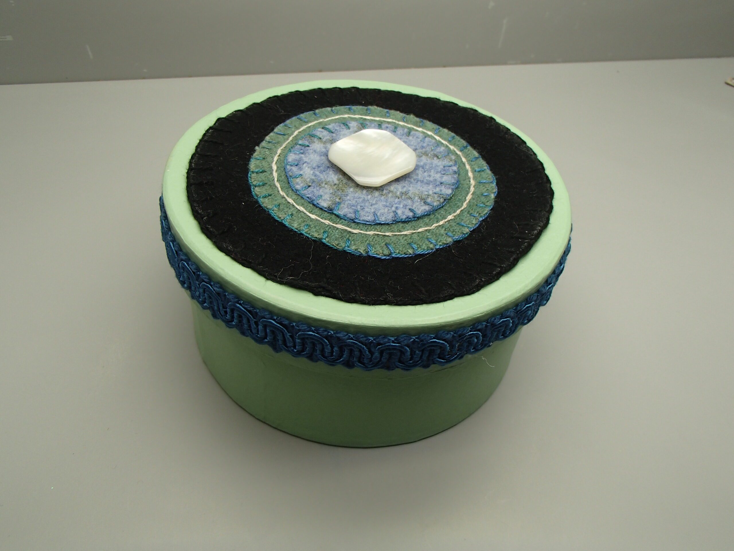 Green paper mache round box with pear button and felt fabric design on lid.