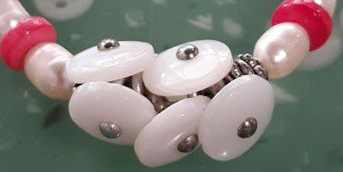 White and pink pearl button bracelet with white shoe buttons as focal with silver toggle clasp.