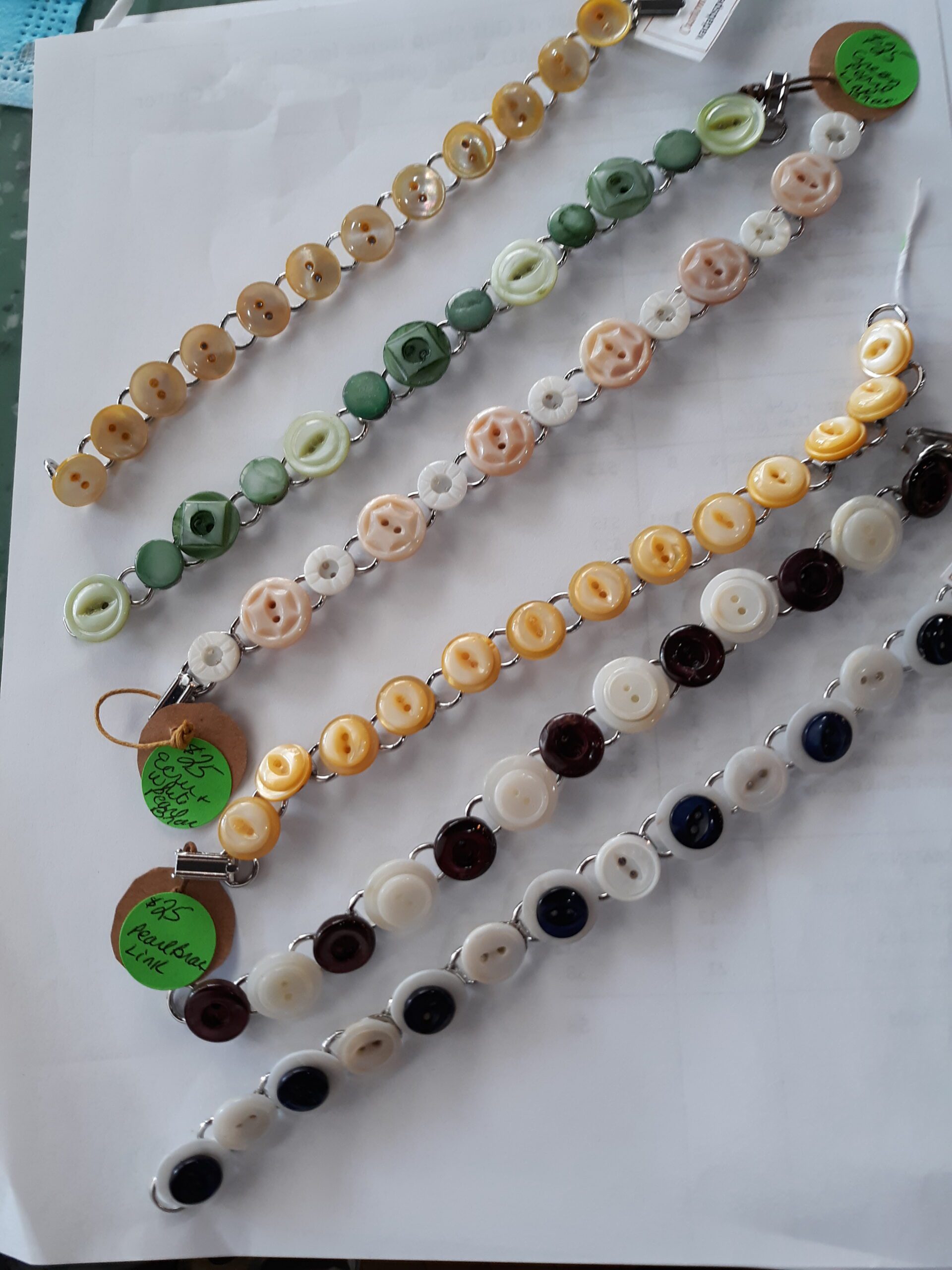 Silver plated link-bracelet with white pearl buttons attached to each bracelet blank.
