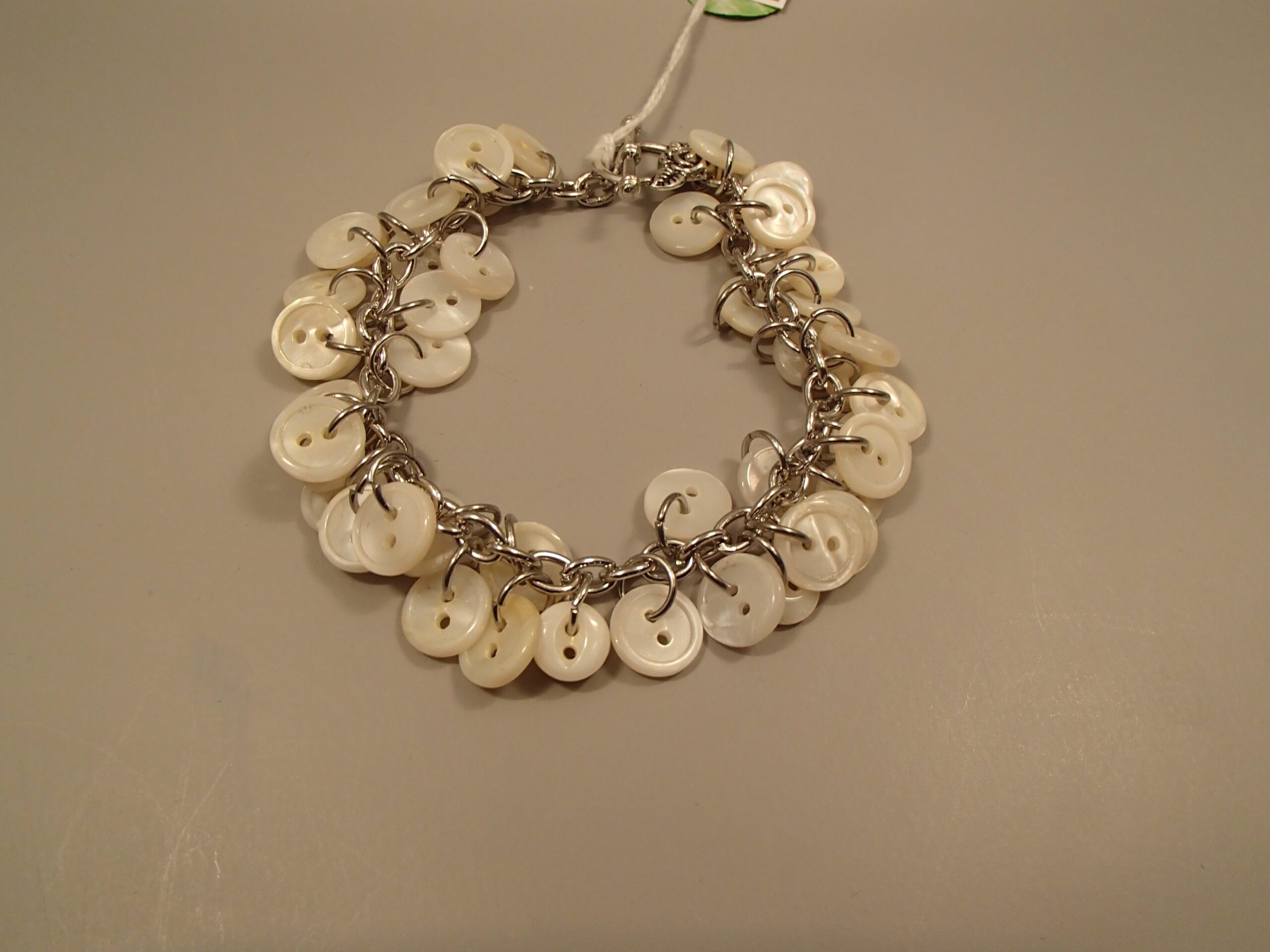 White small pearl buttons on silver colored chain.
