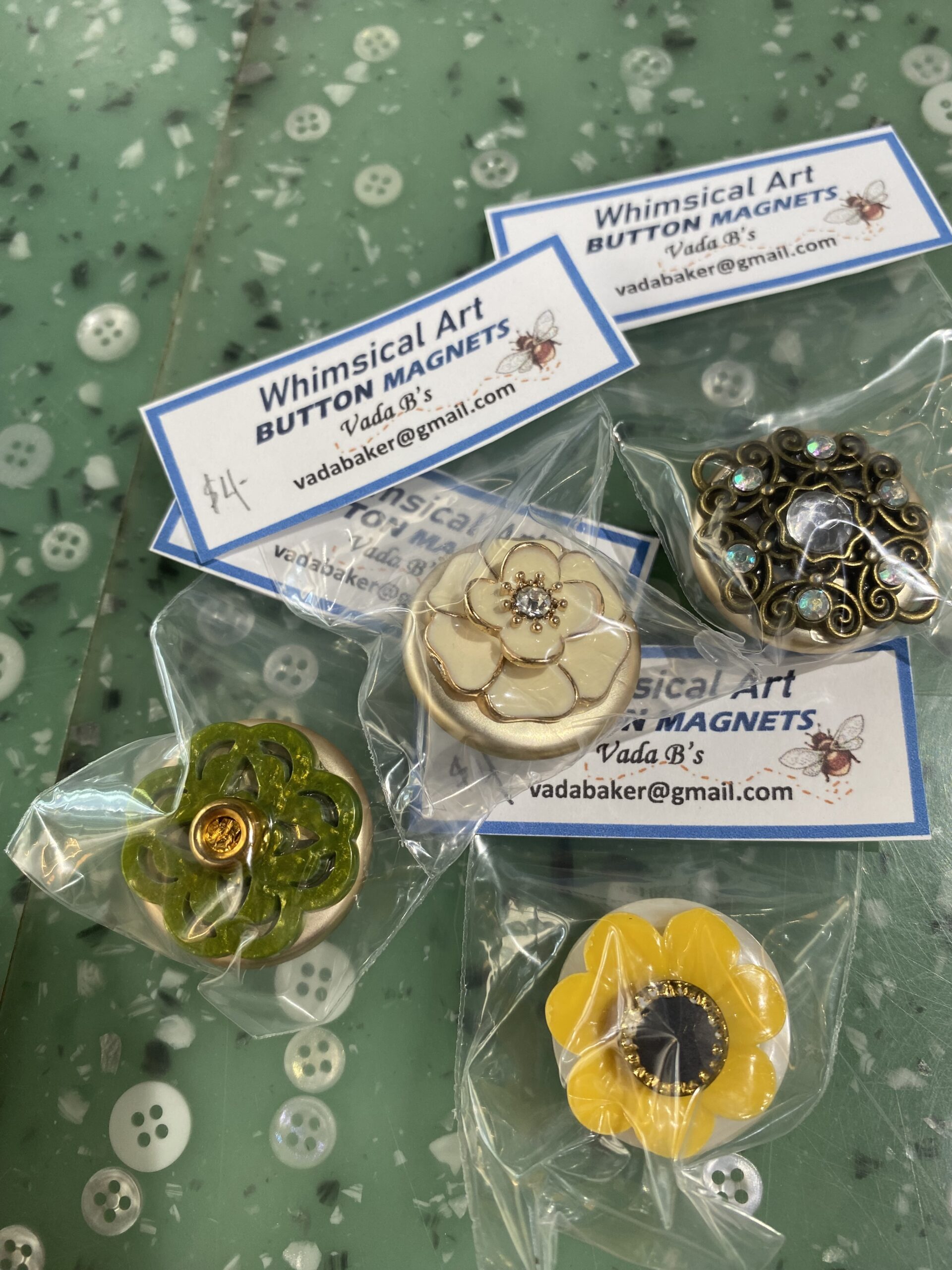 Vintage buttons made into magnets. Color and sizes vary.