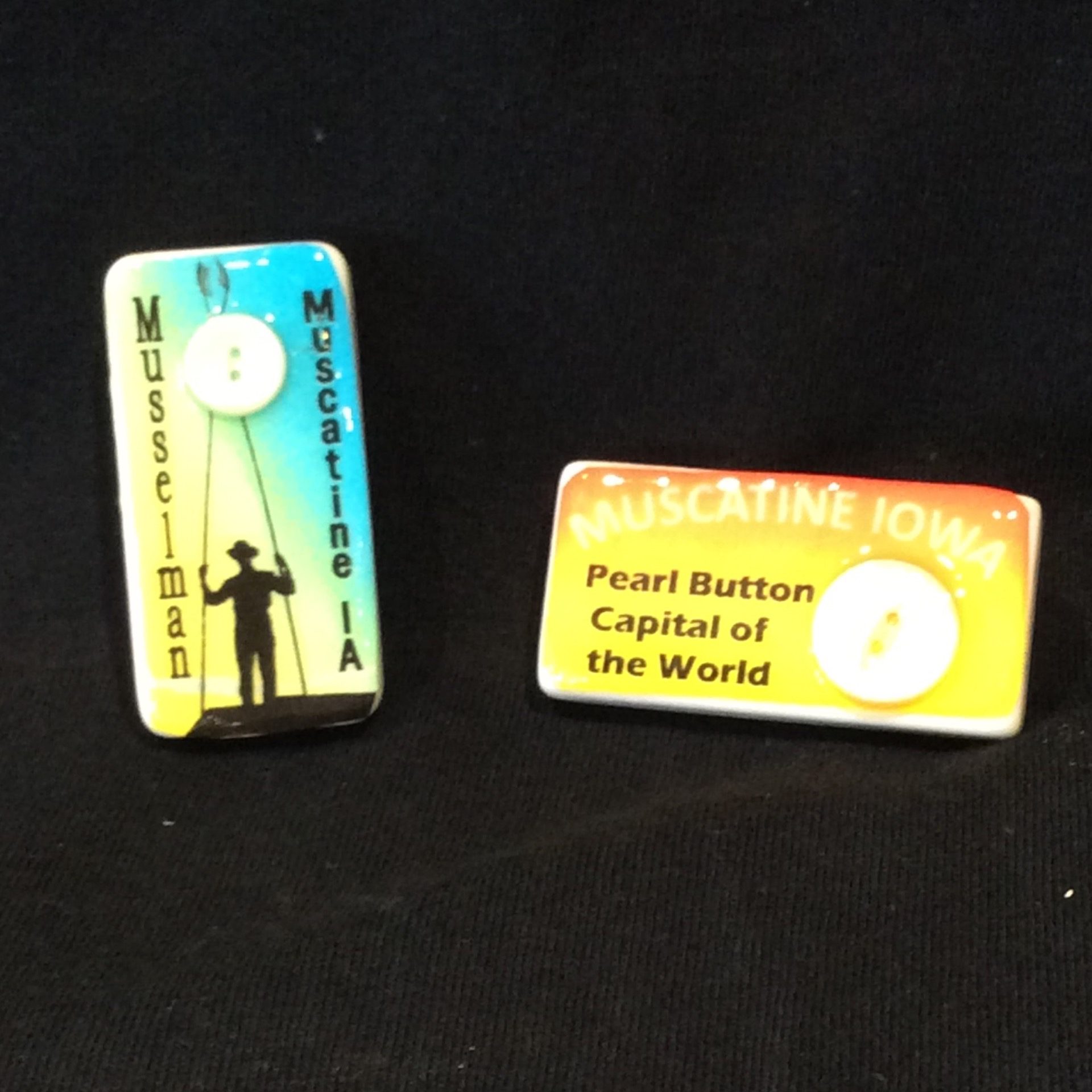 Domino Muscatine magnets. Miscellaneous pictures of Muscatine along with a pearl button on each magnet.