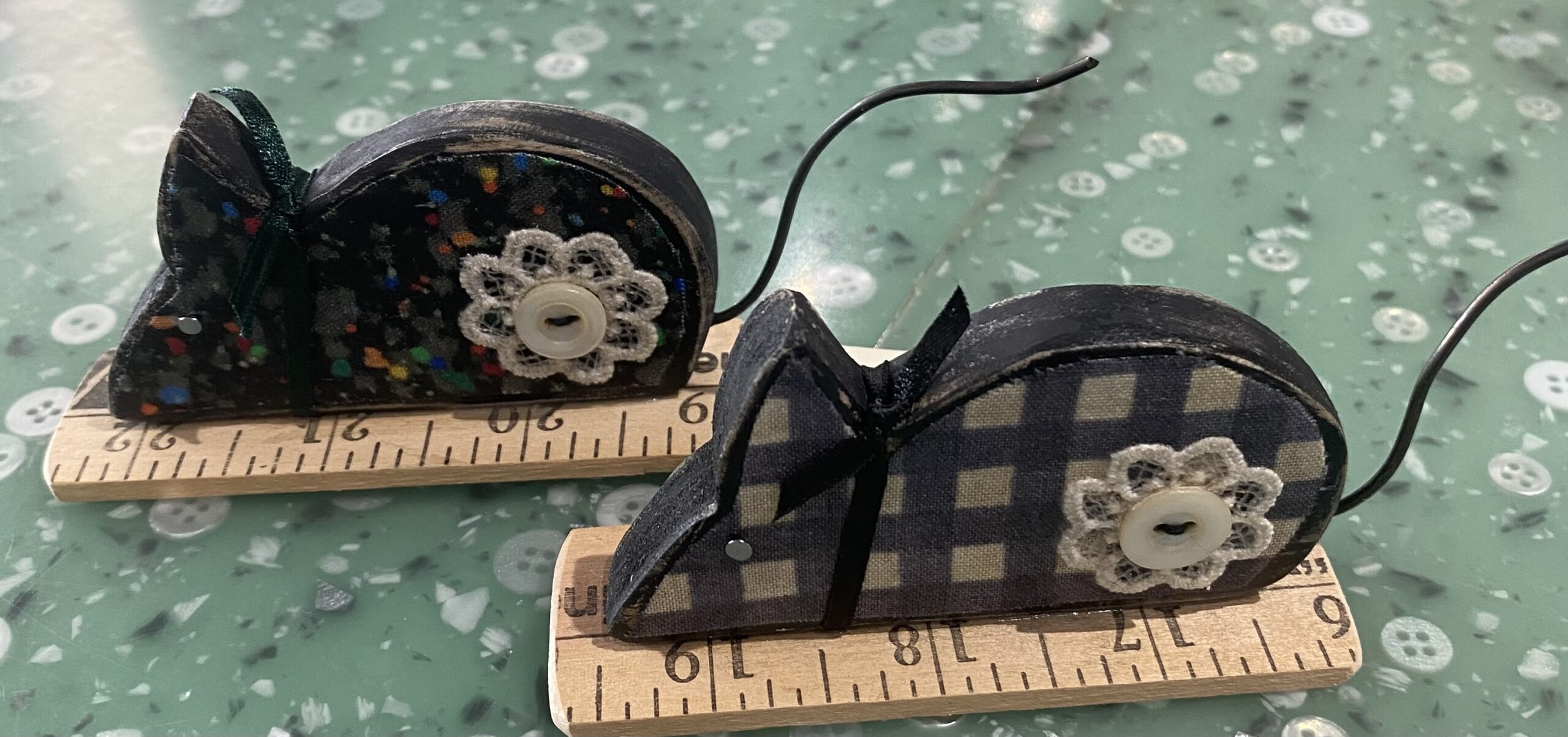 Adorable 3.5” black Or white mice with deco-podged fabric and a pearl button , wire tail and wooden ruler base.