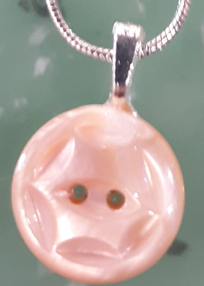 One inch MOP BUTTON WITH DANGLING SMALL MOP STAR. 18” silver plated chain