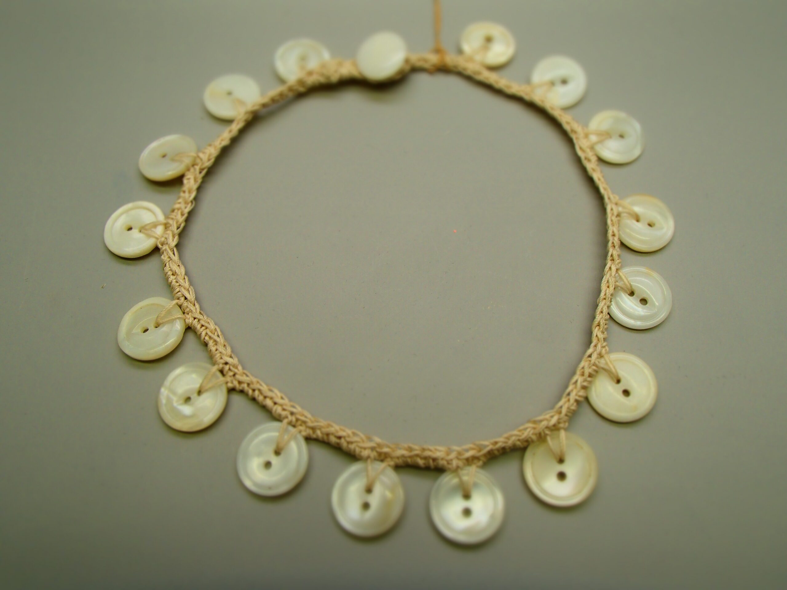Pearl button dangle chocker necklacen with ecru crochet chain.