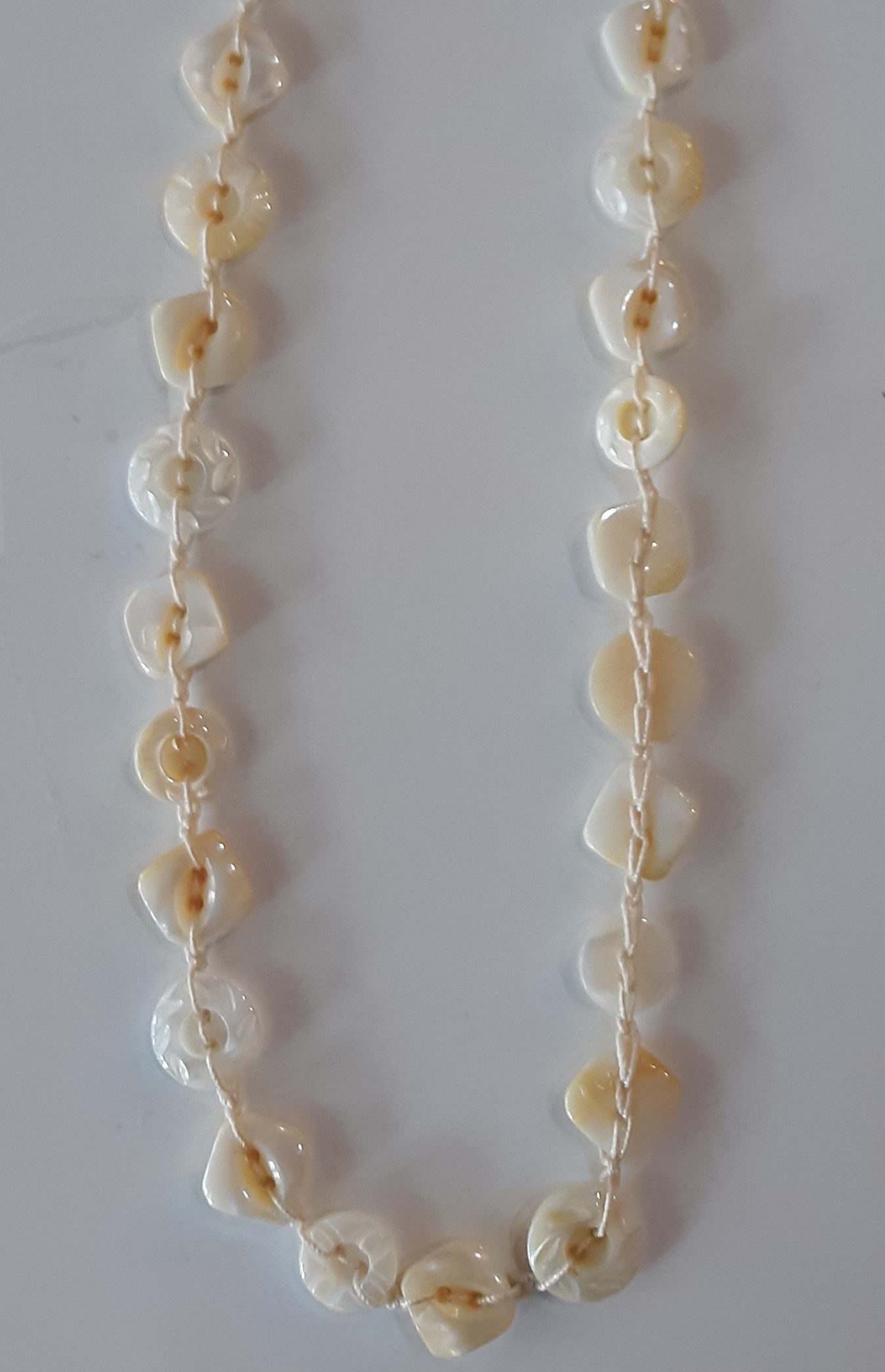 Small fancy cut and square pearl buttons on 22” crochet chain