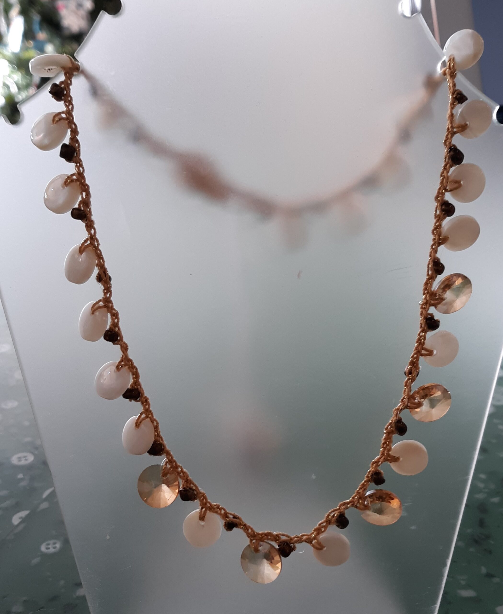 Small white button blanks and amber and brown beads dangle from gold crochet chain.
