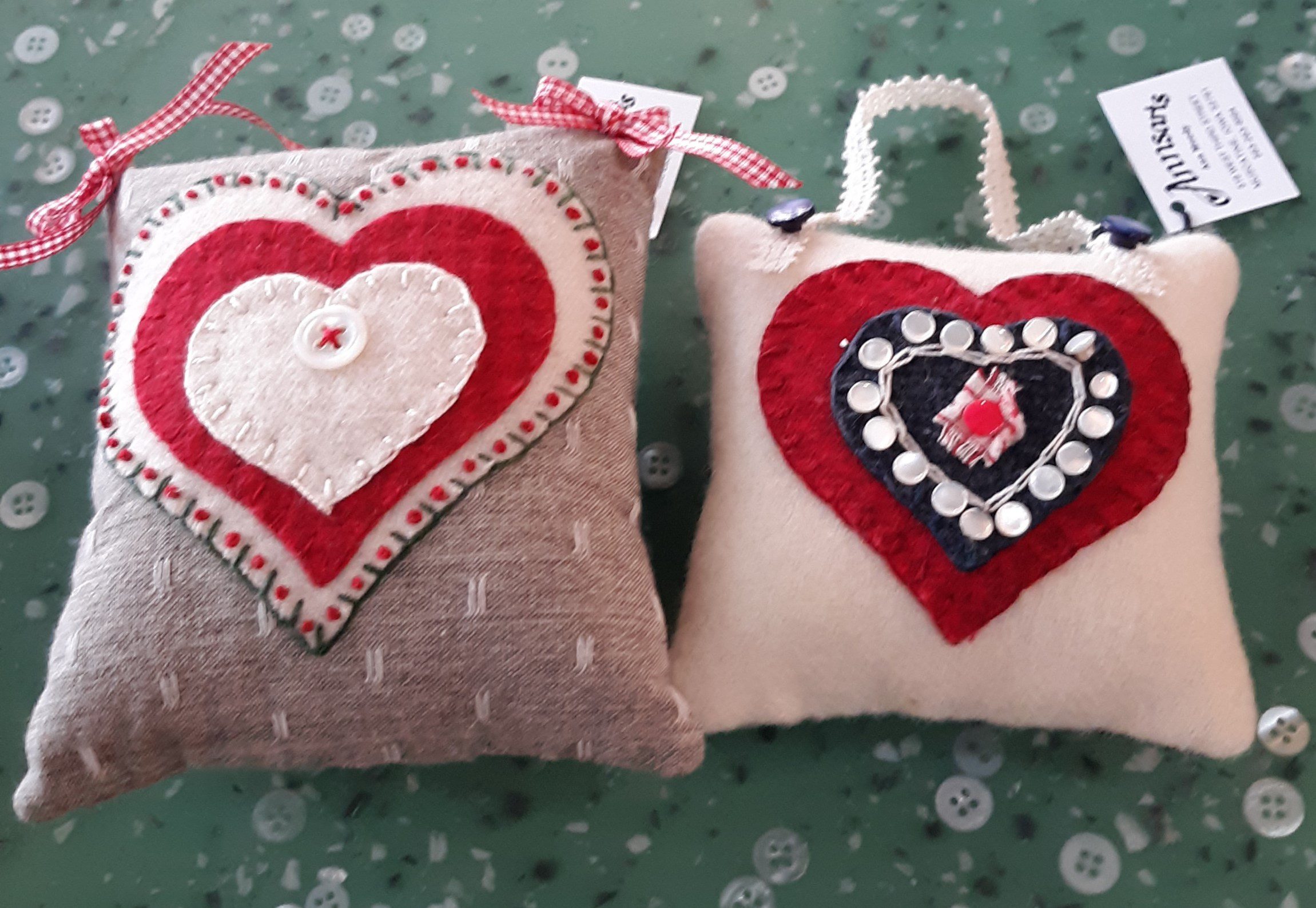 4x4” heart appliqué shelf pillow in various colors