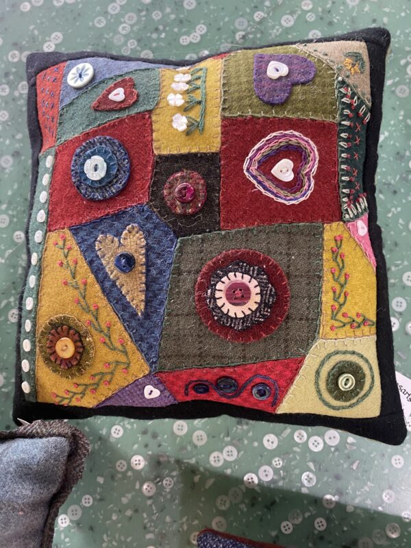 10x10” Quilted and hand embroidered designs with pearl buttons pillow.