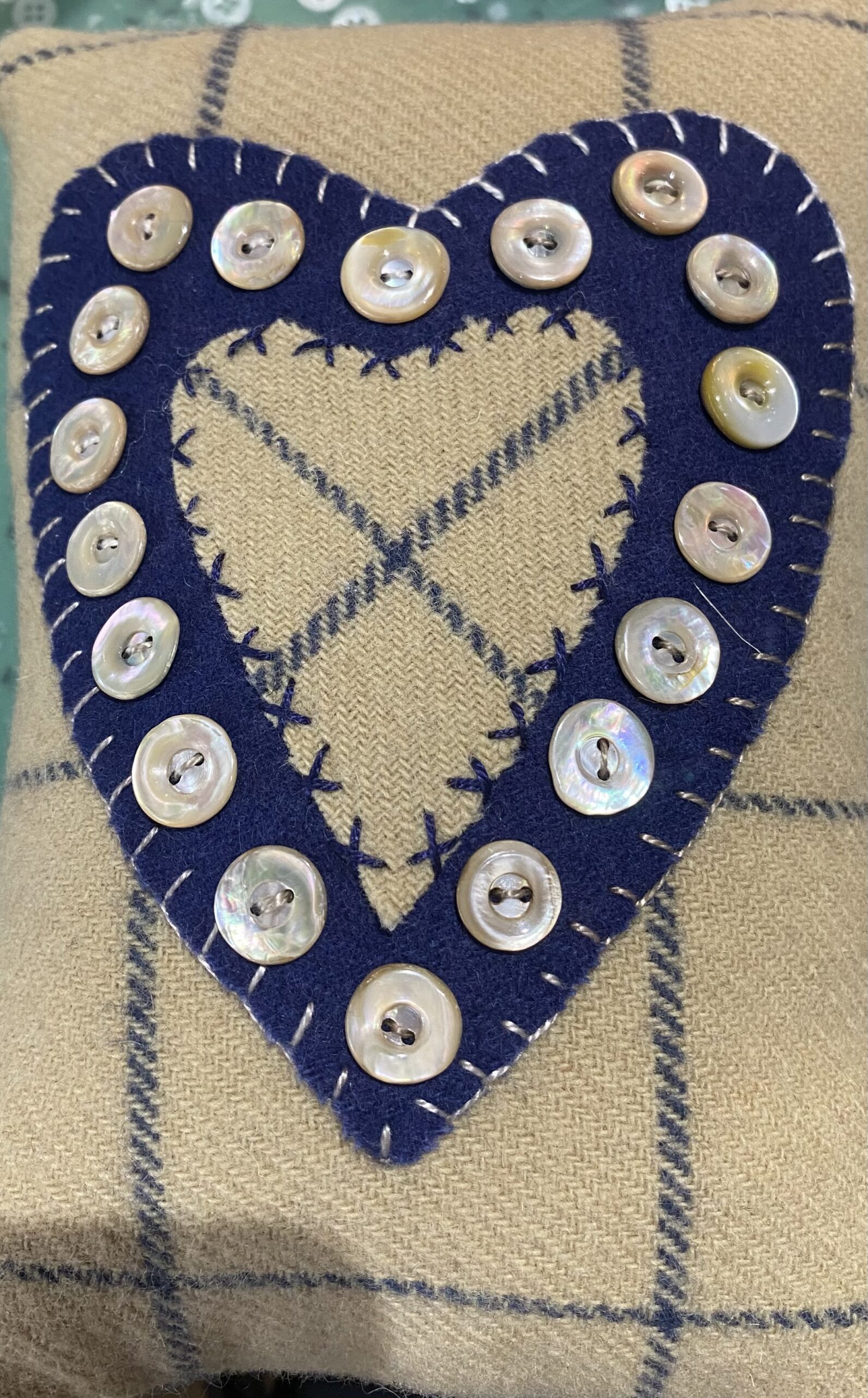 9”x6” shelf pillow. Ecru and navy plaid with Navy heart appliqué. Adorned its beautiful ecru pearl buttons