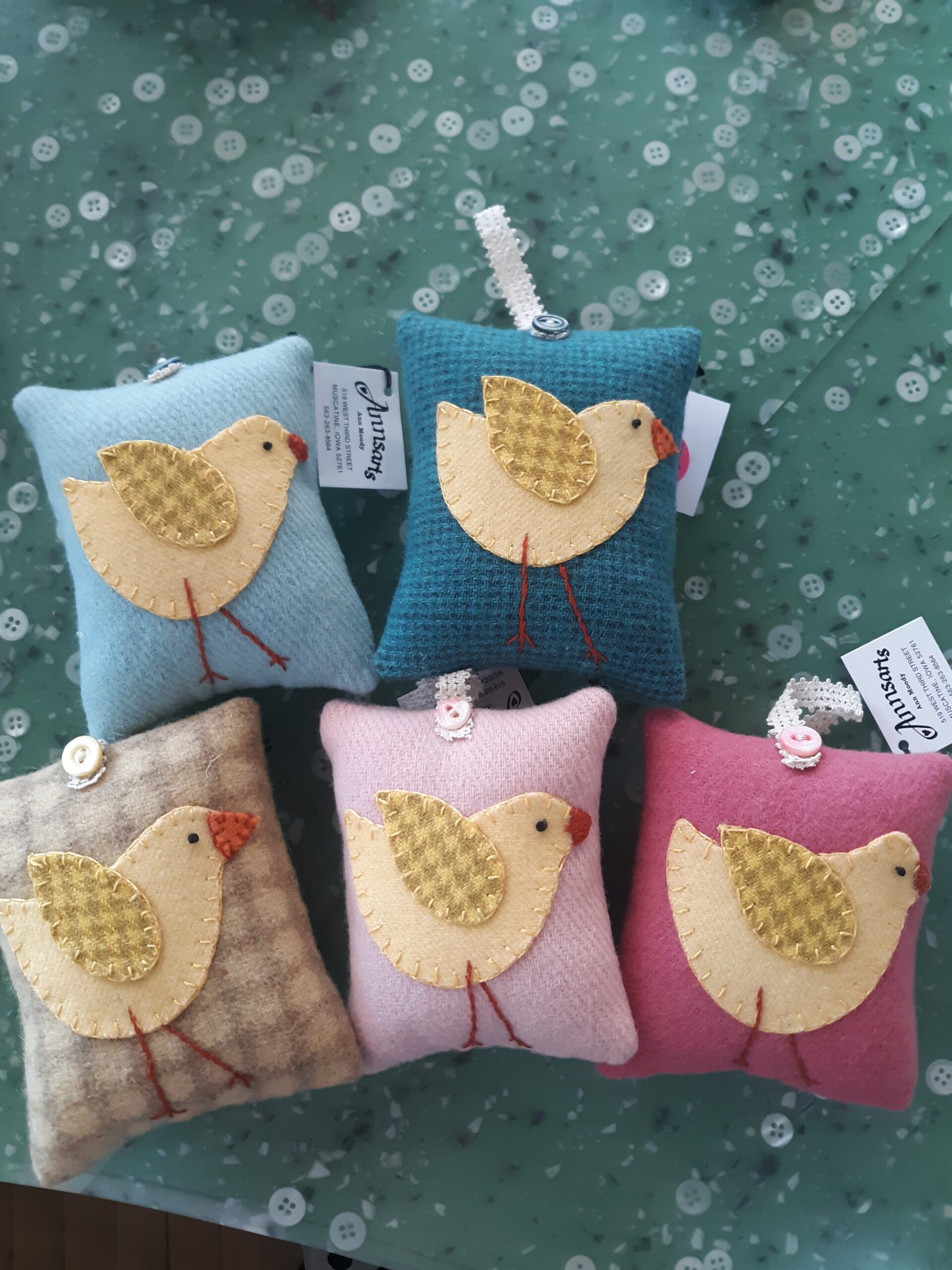 Adorable 4” hanging felt pillows adorned with chick appliqué.