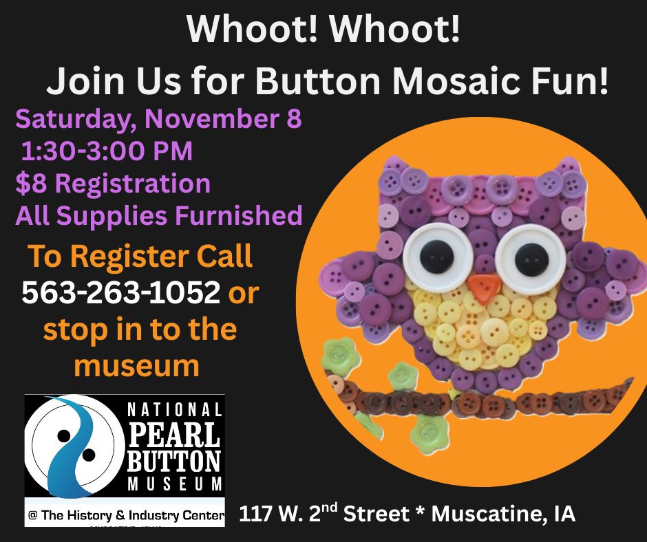 Join Vada Baker on Saturday, November 8th at 1:30 for this fun Button Workshop. Create a happy little owl!